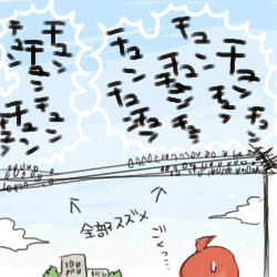 そーいや去年ネズミーランド行った時に衝撃だったんですが都会のスズメってなかなか人なつっこいんですね・・・人間との距離めっちゃ近いですけど!!!何で逃げねぇのこいつら・・・!!ってびっくりした。