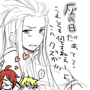 ルークのピンチに颯爽と華麗に自転車(しかもママチャリ)で駆けつけるブレザーガイ!!今日もルークの平和は俺が守るぜ的なガイガイであって欲しいです!!!アッシュ抱き潰してやってくださいー!!そして出来るなら私も抱き潰されたいですn