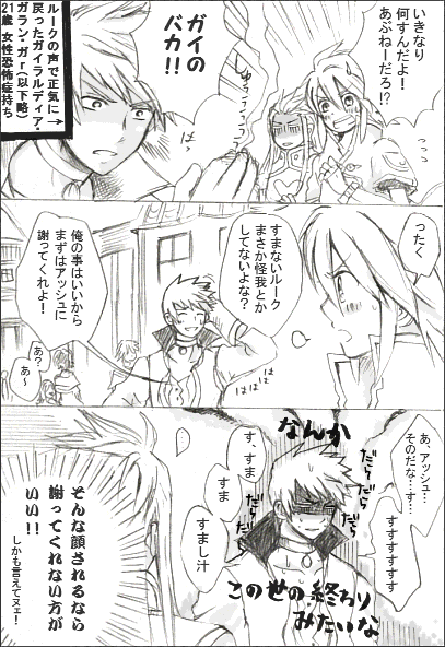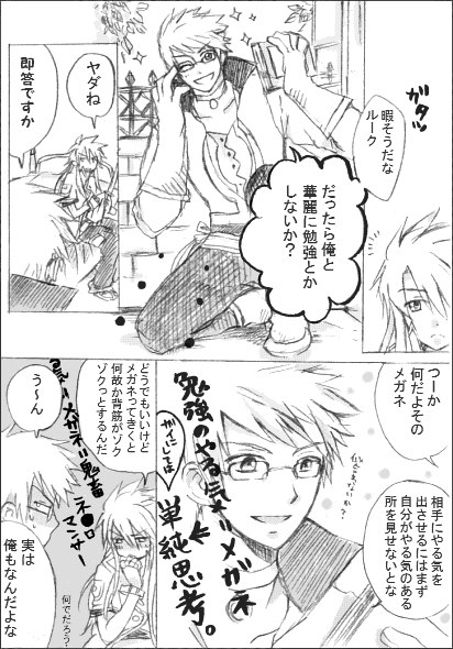 あの三人の組合せもダイスキで・・・!ガイ絡みになるとアッシュがかわいそうな立場だけどその分ルークはアッシュに甘いぜ!(知りません)
