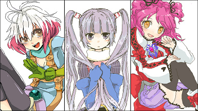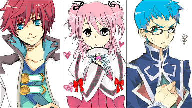 左から、アスベル:いさご、シェリア:ひよりさん、ヒューくん:なも