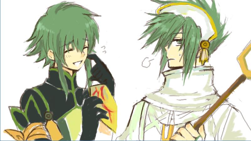 ルークとアッシュの衣装交換はやったことあったけどこの2人ないなぁと思って・・!に、似合わないね爆笑。(いや似合わない最大の原因は絵柄にあると思いますが)だいたいシンクはあの導師キャップ(?)するの凄く嫌がりそうだ。かぶったらシンクじゃないきっと。ということでそのキャップかぶちゃった時点でこのシンクはシンクじゃなくなりました。